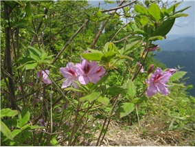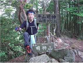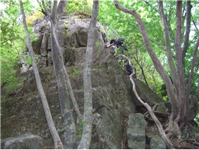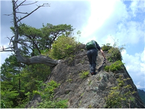 | 11:40 やせた岩稜を登る | 岩稜から見た明神山 | 両側崖で危険だが景色は最高 |
