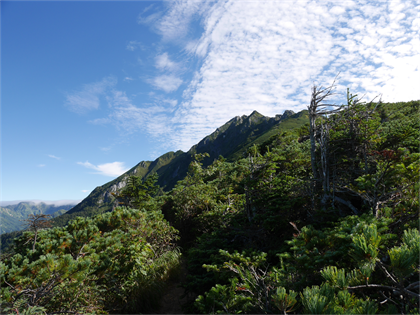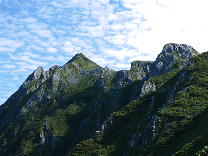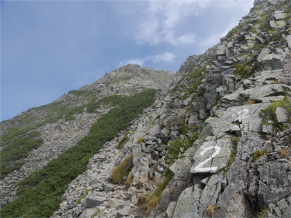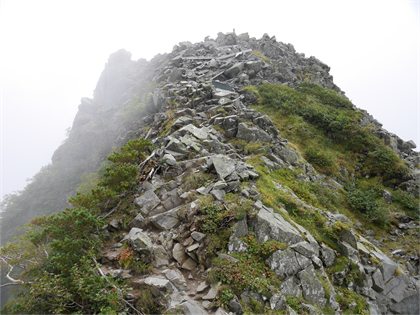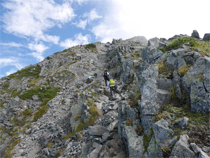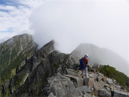 | 笠ヶ岳と双六岳へ続く尾根 | 岩場を進む |