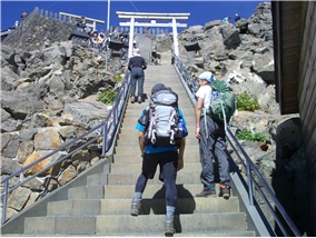 | 9:38 山頂手前 岩と土の山道 | 9:39 剣ヶ峰山荘 階段を登ると山頂 | 9:45 御嶽山山頂(3067m) |