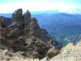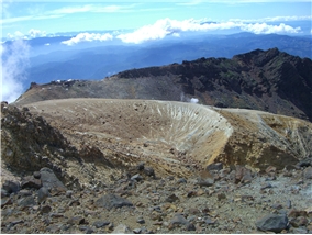 | 一ノ池と外輪尾根 (剣ヶ峰山頂) | 王滝頂上と噴煙 |