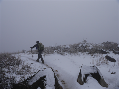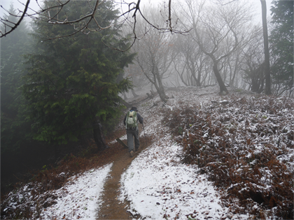 | 今にも雨が降りそうな雲行きからのスタートで、山頂手前付近からは、あられが降り始めた。 | |