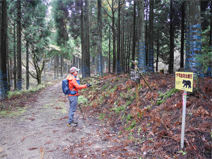 | 林道を進むと看板があり、再び登山道へ | あられが降ってきた |