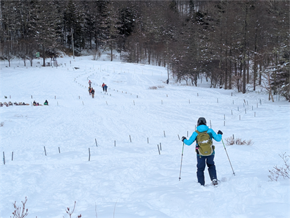 | せっかくなので、帰り道は雪の深いところを選びながら、ワカンの感触とヒップソリで遊びながら下山した。 |
