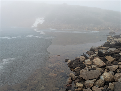 | 溶け始めた氷と水中に伸びる氷柱 | 池を周遊し食事をしながらガスが晴れるのを待つと現れた |