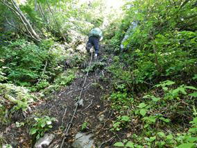 | 7:16 登山口 | 8:58 山頂まで2.3kmの案内 | 連続してロープが続く |