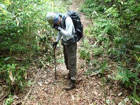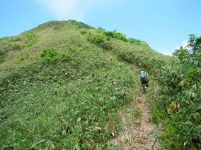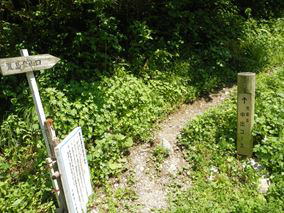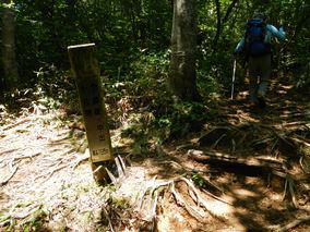 | 虫が大量に目や耳のまわりを飛びまくる | 9:48 樹林帯を抜けると日差しが暑い | 9:56 山頂まで1km |