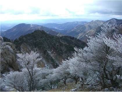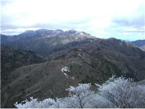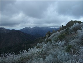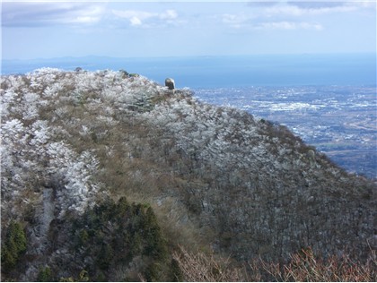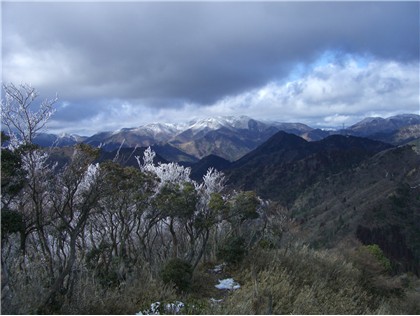 | 山頂から北へ続く道は樹氷で桜が咲いている様な幻想的な感じになっていた | 馬乗り岩から雨乞岳などが一望出来る | 12:12 宮指路岳へ戻り仙ヶ岳を目指す |