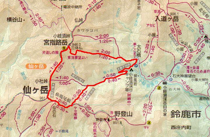 | コース : | 小岐須渓谷大石橋登山口 → 宮指路岳 → 小社峠 → 仙ヶ岳 → 仙ヶ谷登山口 → 大石橋 |