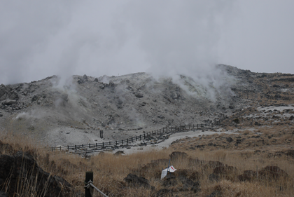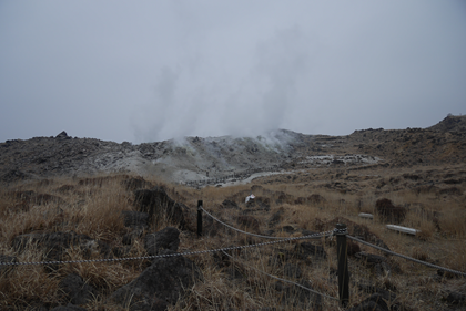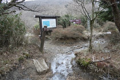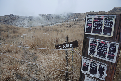 | 噴気も多く硫黄臭がかなり強く感じる | 立ち止まらず早めに通過するようにとの案内もある |
